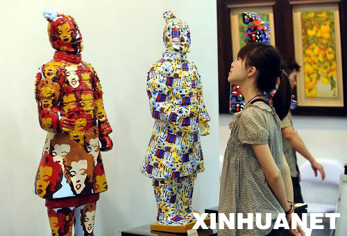 8月27日在台北国际艺术博览会现场拍摄的大陆艺术家刘枫华、刘勇创作的雕塑作品《新兵马俑》