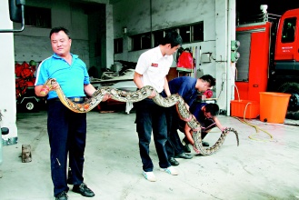 中新网8月31日电 据台湾《联合报》报道,屏东县恒春消防队30日抓到一尾长4.5米,重35公斤的网纹蟒。分队长林坤玉说,首批前往捕蛇的2名队员看到巨蟒,向队部求援,增援2人才把它制伏,因巨蟒身上有被网割伤的伤痕,今天将送屏东科技大学野生动物收容中心治疗。