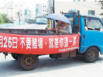 澎湖反赌联盟因经费有限,将卡车贴上布条,改装成克难的“宣传车”,志工累得坐在车上打伞遮荫。图片来源:台湾《联合报》
