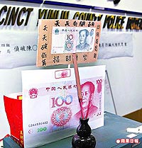 中国台湾网9月2日消息 一群原从事特种行业的台湾年轻男女,因景气欠佳,酒店生意不好,集体转行从事诈骗业,专门骗大陆民众,日前诈骗一名精明的台商遭识破,台商打反诈骗电话报警。台湾警方昨攻坚时发现嫌犯竟将人民币影印放大,上香膜拜,就连电脑屏幕桌面也是人民币图像,不禁笑骂:“真是想钱想疯了!”
