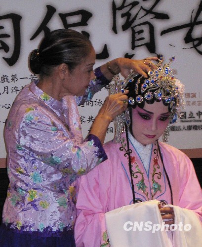 9月11日,被誉为“台湾第一苦旦”的歌仔戏艺术家廖琼枝在台北宣告隐退。“息戏”后,她将退居幕后全身心投入歌仔戏传承与创作工作。在其封箱之作《陶侃贤母》记者会上,七十五岁高龄的廖琼枝更亲自为传承弟子插上珠花,以此举释放出台湾歌仔戏界将全力培养第一苦旦接班人的美好信息。 中新社发 李佳佳 摄