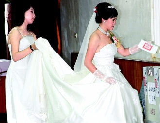 澎湖县昨天举行博弈公投,披着白纱的新娘也不放弃投下宝贵一票,公投结果反赌势力获胜。(来源:台湾《联合报》)