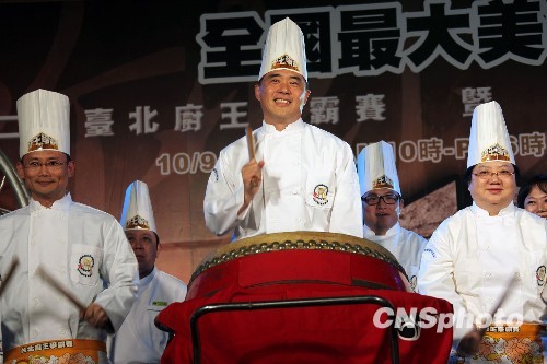 10月9日,台北市长郝龙斌(中)一身厨师装,击鼓为第二届台北厨王争霸赛暨2009台北国际厨王邀请赛热闹揭幕。他表示,要将中华传统美食发扬光大,努力打造台北成为“世界美食之都”。中新社发 黄少华 摄