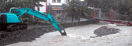 灾情最严重的是冬山乡的太和村,上游的十三份溪在上次芭玛台风来袭时,溪里大量土石淤积,还来不及全部清除,这次又逢大雨,溪水暴涨淹到路面,多条农路封闭。县府工务处紧急出动3台挖土机疏浚十三份溪,避免溪水的水位持续升高,造成更严重的灾情。
