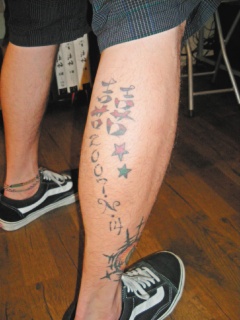 中新网10月14日电 据台湾《联合报》报道,台南市民谢宗昌与大她五岁的妻子郑淑芬酷爱刺青,庆祝儿子周岁,夫妇俩刺星星图案留念;为让太太安心,谢宗昌在腿上刺结婚年月日。在体育用品店当店员的他造型超时髦,顾客买东西常点名要找“刺青”的。