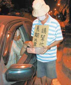 中国台湾网11月4日消息 高雄市的街头最近出现新的“化缘族”,他们端着盘子,挂着“长期失业,请帮忙”的纸牌,夜晚站在十字路口的安全岛上,等红灯一亮,就到车旁向汽车驾驶人“化缘”,有时“摃龟”(空手而回),有时每晚数百元(新台币,下同)。