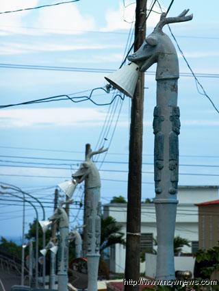 报道说,梅花鹿和当地人有很密切的关系,除了鹿肉是食物来源,鹿皮还可以做衣服,还有部落公主和梅花鹿的恋爱殉情故事;“鹿灯”的创意大概就是这样来的。决定了鹿头当路灯以后,接下来的问题就是,灯要放哪里?放鹿的嘴里吗?想来想去,大概都很难做,所以做出一个圆筒形的灯罩保护灯泡,而这个灯罩就让鹿“咬”着,远看就像咬着广播器的一排鹿,不过,有人觉得比较像咬着奶嘴;但不管像广播器还是奶嘴,这个灯罩并不是很稳固,风一吹来灯罩还会在鹿的嘴里摇来摇去,真的是极为爆笑的“活生生”鹿灯。