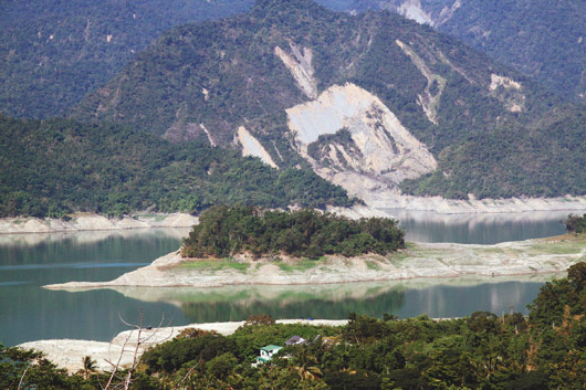 曾文水库水位节节下降,边坡裸露明显,水库中竟形成小岛。图片来源:联合报