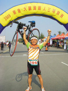 张炳荣昨天参加屏东东港大鹏湾51.5公里全台铁人三项竞赛,先游泳1.5公里,再骑自由车40公里,最后跑10公里,3小时7分的成绩完成比赛。超级铁人三项协会被他的毅力和精神感动,昨天颁给他荣誉VIP奖。