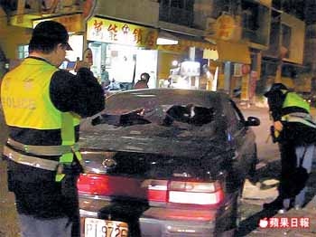 台南一名女子的轿车,昨晚被飚车族莫名痛砸。 来源:台湾《苹果日报》