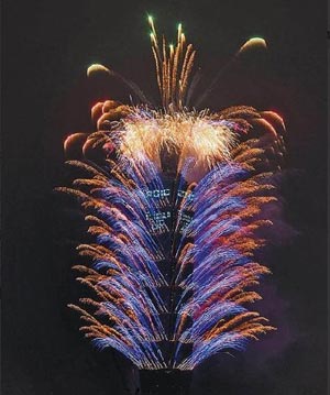 紧接上场的霹雳虎尾烟火,劈里啪啦撼动全场,101大楼外墙亮起“2010 Taiwan UP(意谓2010年台湾会更好)”字样,最后压轴齐发1700发烟花,精采程度令人目不暇给,白闪花束、金闪虎尾等各款烟火齐升空,2.2万发烟火、历时188秒的烟火秀在欢呼声中结束。