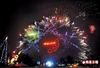 中国台湾网1月1日消息 据台湾《苹果日报》报道,不让台北101大楼专美,2010年的第一刻,台湾中、南部的天空也同步开出灿烂烟花。高雄梦时代广场长达199秒的跨年烟火秀,1万8000发万紫千红的烟火,与梦时代摩天轮车厢LED灯相互辉映,现场50万人齐呼:“新年快乐!”云林剑湖山和高县义大世界都上演摩天轮烟火秀,剑湖山摩天轮更射出10颗心心和“LOVE 2010”图样,现场情侣都忘情用热吻迎接新的一年。