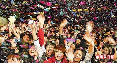 台中市跨年晚会倒数结束后,撒下庆祝新年的纸花,民众兴奋不已。来源:台湾《苹果日报》