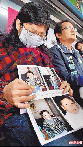 沈姓男童疑因施打甲流流感疫苗猝死,他的母亲昨天手持儿子照片出席记者会,难忍悲痛数度哭泣。 来源:台湾《苹果日报》