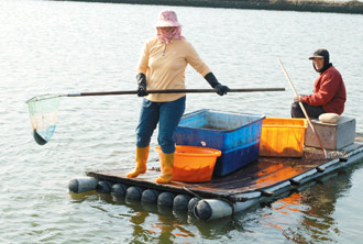 寒流趋缓,温差大造成冻伤的鱼死亡,云林沿海业者无奈捞起死鱼。(图片来源:台湾《联合报》)