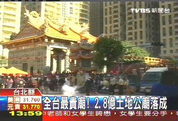 中新网1月19日电 据台湾TVBS报道,台北县的深丘福德宫,因为盖在黄金地段的新板特区,以2年前一平米200万(新台币 下同)的地价计算,这间土地公庙地价已经高达2.8亿,号称是全台最贵的庙。之前因为采购法迟迟无法完工,最近终于盖好了,上午举行安座大典,神明搬新家,场面相当热闹。