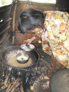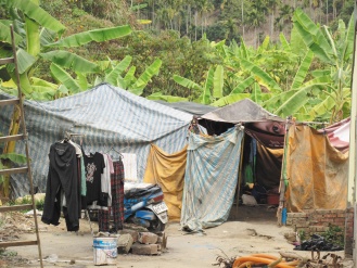 简陋破落帐篷搭在香蕉园里,卓姓夫妻与儿子挤在不到两坪的空间里;室内堆放着脏乱衣物等用品,睡觉的地方用木板稍隔开,陈设比起工寮还要简陋。紧邻厨房仅有一只烧柴锅子,卓家女主人锅子正在蒸蛋,蒸蛋的水暗沉,她说:“这是早餐。”