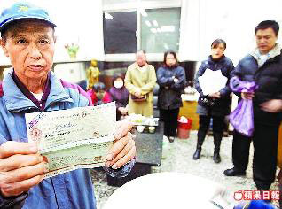 卖水果的老伯展示两张没用的支票。图片来源:台湾《苹果日报》