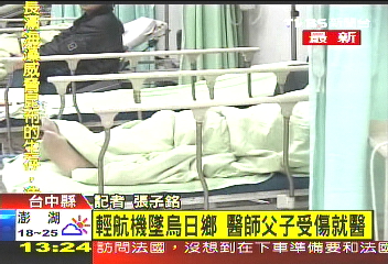 据报道,黄姓父子二人早上9点半,搭乘轻航机从彰化起飞后,到10点多不知何因坠毁在台中县乌日乡,2人已经被送往南投佑民医院治疗。院方表示,儿子腰椎受伤,父亲身体多处擦伤,还好伤势并不严重,经过简单包扎后已回家休养。(王赛赛)