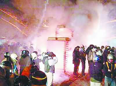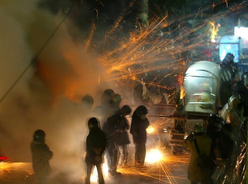 紧张的时刻终于来了。伴随着电子音乐,神轿摇摇晃晃地向我们所在的炮城前走过来了。突然之间就“炸开了锅”,只听见震耳欲聋的炮仗声,无数冲天炮呼啸着在身边钻来钻去,我吓得连声尖叫,不停地跳脚,想躲不知从何躲起,想逃却无处可逃,被挤在人群之中,到处硝烟弥漫。