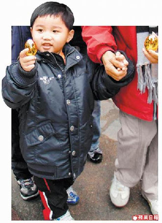 小朋友开心展示到南投竹山紫南宫排队领到的金鸡蛋。 来源:台湾《苹果日报》