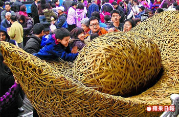 南投紫南宫昨拥入逾10万名信众,抢着滚动藤编金元宝,祈求财源滚滚来。来源:台湾《苹果日报》