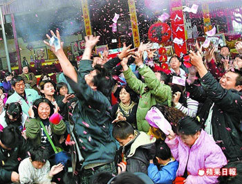 高雄县旗山开基八路财神庙昨施放“发财大炮”,民众争抢从天而降的现金,今天会再施放。来源:台湾《苹果日报》