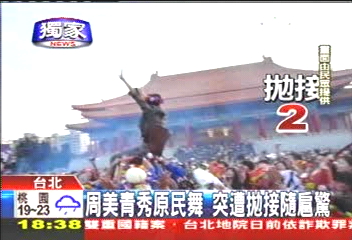 中国台湾网3月1日消息 昨天马英九夫人周美青欣赏音乐剧演出,一时兴起,亲自下海跟着大跳原住民舞蹈。周美青舞跳得忘情,还四度被舞者抛向天空,也让现场民众见识周美青活泼的一面。