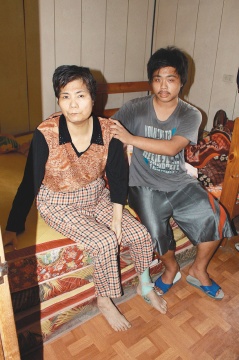 17岁少年吕建庭(右)为照顾中风母亲,睡在母亲旁边全天候侍奉。