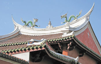 台南市祀典武庙,拜殿屋脊上双龙七层玲珑宝塔震后只剩两层,中间露出钢筋。图片来源:台湾《中国时报》