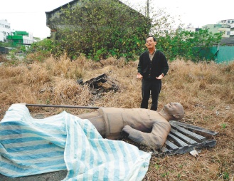 高雄县凤山火车站前的蒋介石铜像被拆下,弃置车站附近杂草地,当地曹公里长翁国忠摊开双手,表示无奈。来源:台湾《联合报》