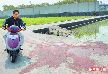 刘彦聪在路上被砍死,地上留下大滩血迹,行人途经纷纷走避。 来源:台湾《苹果日报》