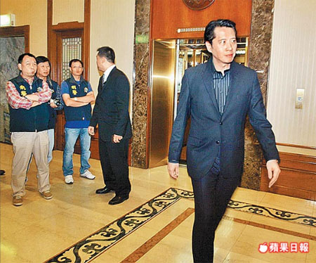 蓝、绿政治人物均到场,台北市议员欧阳龙(右)餐后离开会场。 来源:台湾《苹果日报》