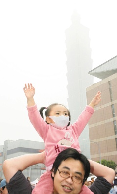 台北101大楼笼罩在沙尘之中,家长为小朋友戴上口罩。图片来源:台湾《联合报》
