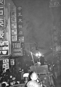 1985年台南帝王大饭店大火造成28死,纵火主嫌之一的陈东荣逃亡近25年落网。图为案发当时救援场面。图片来源:台湾《中国时报》