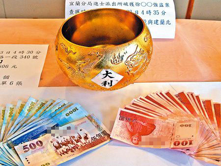 台湾怪匪托钵抢劫,所托的钵是金色、塑料制,表面贴有“大吉”、“大利”、“招财进宝”等吉祥字样。 来源:台湾《中国时报》