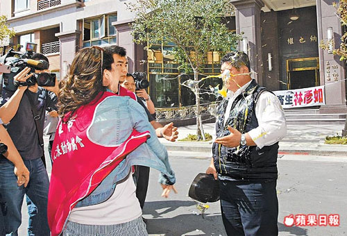 动物保护人士情绪激动的逼问林彦如(右)为何虐狗、并朝林丢鸡蛋,一颗鸡蛋就正中林的脸部。 来源:台湾《苹果日报》