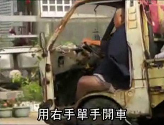 独臂老翁仅以右手驾驶无牌无门的货车穿梭,险象环生。