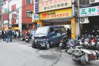男子林明典昨天下午开厢型车在台北县三重市街头疯狂肇事,警察开了16枪才制止他疯狂行径,现场左边就是当地派出所。(图片来源:台湾《联合报》)