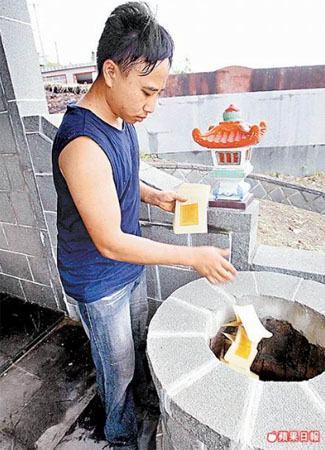 除了打扫整理墓园外,部分客户还要求“代客扫墓”的业者帮忙祭拜先人。 来源:台湾《苹果日报》