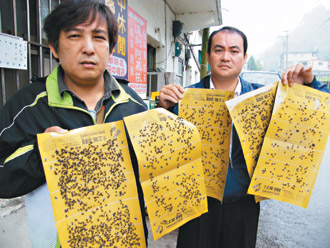 新竹县尖石乡新乐村水田部落最近陷入“苍蝇危机”,图为粘满苍蝇的黏蝇板。图片来源:台湾《联合报》