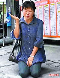 涉嫌体罚女童的安亲班主任,还曾入选台中县优良老师,昨天面对家长,一时情急竟当街下跪,自掴耳光,却仍无法得到谅解。图片来源:台湾《苹果日报》