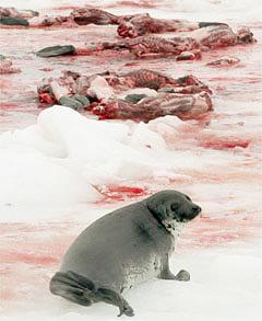 刚出生19天的海豹宝宝,发出哀嚎凄厉的叫声,因为有的都还没离开海豹妈妈的怀抱,就被猎人用棍棒活活打死,95%在加拿大海豹猎捕季中,被杀害的海豹,平均都不到3个月大。几万只海豹横躺血泊中,残忍的画面,让欧美国家群起抵制海豹毛皮产制品。