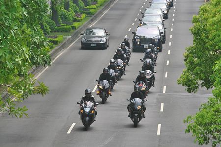 图为“憨面”移灵车队由12辆哈雷前导,后面跟著30多辆双B(奔驰、宝马)。 图片来源:台湾《中国时报》