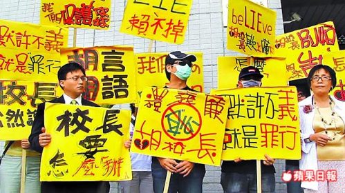 人本教育基金会和被害男童家长到法院举标语抗议判决结果。来源:台湾《苹果日报》