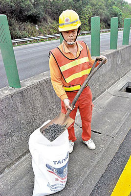 台湾高速公路警方紧急出动清洁人员清除螺丝钉。 图片来源:台湾《中国时报》