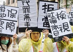 台中县曹姓妇人携女烧炭自杀双亡,外界指社会工作人员失职,引发社工不满。台“社工工会”筹备小组23日号召百余位社工前往“内政部”,举标语抗议政府带头卸责,并要求“内政部长”江宜桦对其指社工不够积极的言论,公开道歉。图片来源:台湾《中国时报》 刘宗龙摄