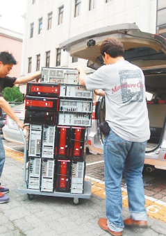 台警方、检方扫荡岛内最大签赌网站,同步搜索140个签赌据点,查扣数百组计算机机台,得用推车搬运。 来源:台湾《联合报》