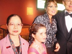 台湾爱心阿嬷陈树菊(前左)赴美接受《时代》表扬,昨天她穿着朴实出席善行晚宴。大方向美国共和党政治明星裴林(后左)致意。图片来源:台湾《中国时报》