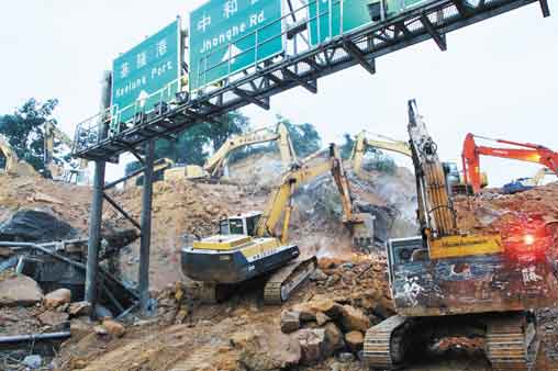 台高速公路三号七堵段发生走山意外,各式机具连夜挖掘抢救,希望加快速度救出疑遭掩埋的车辆与驾驶。资料图片